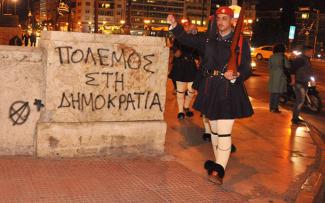 Σύμβολα, τουριστική ατραξιόν, ιστορία, φρουροί του Αγνώστου Στρατιώτη, όπως θέλετε πείτε τους. Αγέρωχοι και λεβέντες, όπως πρέπει να είναι, περνούν δίπλα από το «Πόλεμος στην Δημοκρατία». Το έγραψαν με σπρέι χθες. Ευτυχώς τα σπρέι δεν σκοτώνουν. Ίσως μόνο την αισθητική μας...