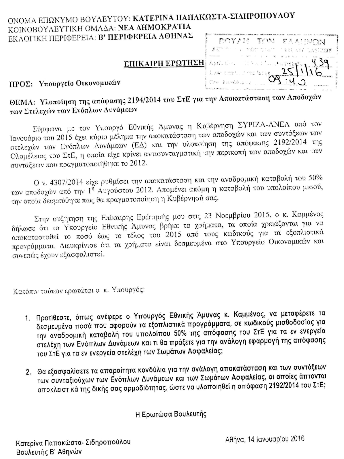 «Εντός του πρώτου εξαμήνου του 2016 το υπουργείο Οικονομικών θα δει από μηδενική βάση το θέμα των ειδικών μισθολογίων, όχι μόνο των Ενόπλων Δυνάμεων και των Σωμάτων Ασφαλείας αλλά συνολικά των ειδικών μισθολογίων» δήλωσε ο κ. Χουλιαράκης σε απάντηση ερώτησης που είχε καταθέσει η βουλευτής της Ν.Δ. Κατερίνα Παπακώστα σχετικά με την αποκατάσταση των μισθών και των συντάξεων.