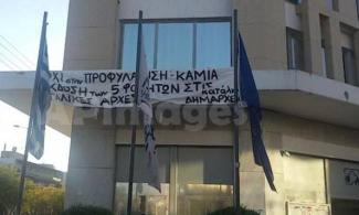 Έξω από το δημαρχιακό μέγαρο έχει αναρτηθεί πανό με το αίτημα των καταληψιών.