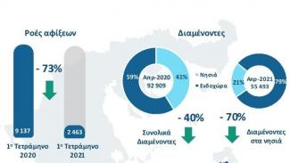 Οι αφίξεις το πρώτο τετράμηνο του 2021 είναι μειωμένες κατά 73% σε σχέση με το πρώτο τετράμηνο του 2020. Ωστόσο, οι ροές για τον Απρίλιο του 2021 παρουσιάζονται αυξημένες κατά 1.039% σε σχέση με τον αντίστοιχο μήνα του 2020.