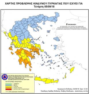 Σύμφωνα με το Χάρτη Πρόβλεψης Κινδύνου Πυρκαγιάς που εκδίδει η Γενική Γραμματεία Πολιτικής Προστασίας του Υπουργείου Προστασίας του Πολίτη (www.civilprotection.gr), για αύριο προβλέπεται πολύ υψηλός κίνδυνος πυρκαγιάς (κατηγορία κινδύνου 4) για τις εξής περιοχές: