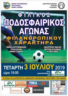 Σας πληροφορούμε ότι την Τετάρτη 3 Ιουλίου 2019 και ώρα 19:00΄ στο Αθλητικό Κέντρο «ELPISNIKI» στο Αγροκήπιο Χανίων, η Ένωση Αστυνομικών Υπαλλήλων Νομού Χανίων και ο Αθλητικός Όμιλος Βρυσών Κυδωνίας «Πέργαμος» θα διοργανώσουν φιλικό ποδοσφαιρικό αγώνα φιλανθρωπικού χαρακτήρα.