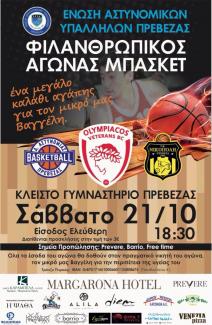 Η Ένωση Αστυνομικών Υπαλλήλων Πρέβεζας, στα πλαίσια των κοινωνικών της δράσεων διοργανώνει αυτόν τον φιλανθρωπικό αγώνα μπάσκετ, στον οποίο η ομάδα Βετεράνων του Ολυμπιακού θα αγωνιστεί με τους βετεράνους του Σ.Κ Νικόπολης Πρέβεζας και την ομάδα της Διεύθυνσης Αστυνομίας Πρέβεζας.