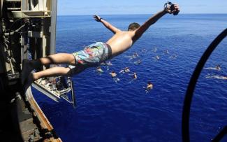 Τι στιγμή που αρκετός κόσμος δεν έχει πρόσβαση στη θάλασσα, ναύτες, πεζοναύτες και λοιπό προσωπικό ενός αμερικανικού αεροπλανοφόρου, περνούν ξέγνοιαστες στιγμές -όποτε το απαιτούν οι περιστάσεις- στις καλύτερες «πισίνες» του κόσμου.