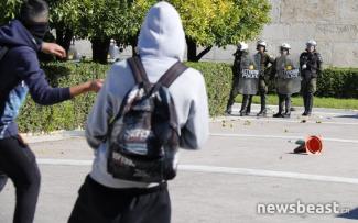 Στη συνέχεια, οι νεαροί πέταξαν πέτρες προς την πλευρά των τροχονόμων που βρίσκονται στην είσοδο του γκαράζ της Βουλής. Αποτέλεσμα, σύμφωνα με το Αθηναϊκό Πρακτορείο Ειδήσεων, ήταν να ξεκινήσουν συμπλοκές μικρής έντασης μεταξύ των νεαρών κουκουλοφόρων και δύναμης των ΜΑΤ που φυλάσσει τη Βουλή.