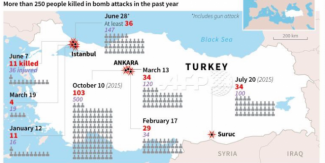 Ανοχύρωτη χώρα έναντι στην τρομοκρατία η Τουρκία. Ο χάρτης του τρόμου που δημοσιεύει το AFP προκαλεί σοκ. Σ΄ αυτόν αποτυπώνονται οι τρομοκρατικές επιθέσεις των τελευταίων 12 μηνών σ΄ όλη τη Τουρκία. Περισσότεροι από 250 οι νεκροί.