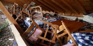 Τα πιάτα βρίσκονται ακόμα πάνω στα τραπέζια, γεμάτα φαγητά, ενώ τα συνεργεία προσπαθούν να απομακρύνουν το στέγαστρο που σκόρπισε τον θάνατο.