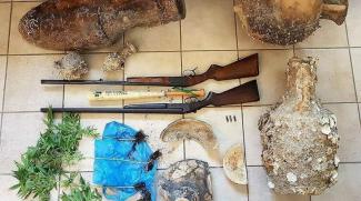 Με μια σειρά διαδοχικών ερευνών στα σπίτια τους, οι αστυνομικοί της Ασφαλείας ανακάλυψαν στην κατοχή ενός 46χρονου τέσσερα δενδρύλλια κάνναβης που καλλιεργούσε, ένα τμήμα εναλίου αμφορέα και τρία φυσίγγια διαμετρήματος 0,32 χιλιοστών. Ένας 47χρονος είχε στο σπίτι του έναν ενάλιο αμφορέας, ένα τμήμα αμφορέα και άλλα δύο ενάλια αντικείμενα, αλλά και δύο κυνηγετικά όπλα χωρίς άδεια. Ένας 49χρονος είχε τρία τμήματα αμφορέα και πήλινων πιάτων και ένας 45χρονος ένα ξύλινο ρόπαλο τύπου baseball μήκους 0,60 εκατοστών!
