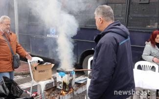 Ανήμερα λοιπόν της Τσικνοπέμπτης οι συγκεντρωμένοι έστησαν ψησταριές μπροστά από τις κλούβες της Αστυνομίας διαμαρτυρόμενοι για τις απολύσεις στο Δρομοκαΐτειο, ενώ κρατούν πανό που γράφει «Θα πούμε το ψωμί ψωμάκι».