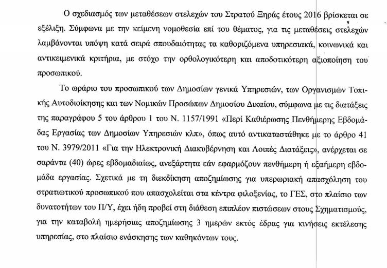 Επίσης για πρώτη φορά δίνεται έστω και συμβολικά αποζημίωση των στρατιωτικών με την μορφή οδοιπορικών για υπερωριακή αποζημίωση, στα κέντρα φιλοξενίας προσφύγων.