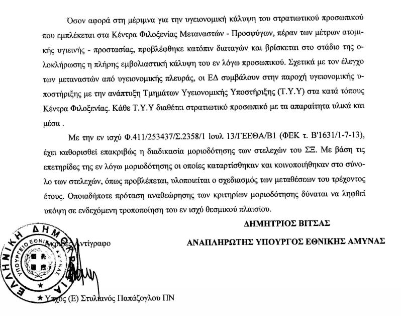 Τέλος δίνει και νέα τόσο για το θέμα της υγειονομικής κάλυψης των Στρατιωτικών στα κέντρα φιλοξενίας που σύντομα θα αρχίσει ο εμβολιασμός τους όπως αναφέρει ενώ το θέμα τόσο των μεταθέσεων όσο και τρόπου μοριοδότησής τους θα εξετασθεί μελλοντικά .