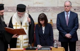 Παρουσία του πρωθυπουργού Κυριάκου Μητσοτάκη και των πολιτικών αρχηγών και χοροστατούντος του Αρχιεπισκόπου Αθηνών κκ Ιερωνύμου, η κ. Σακελλαροπούλου ορκίστηκε “στο όνομα της Αγίας και Ομοούσιας και Αδιαίρετης Τριάδας” να φυλάσσει το Σύνταγμα και τους νόμους, να μεριμνά για την πιστή τους τήρηση, να υπερασπίζει την εθνική ανεξαρτησία και την ακεραιότητα της Χώρας, να προστατεύει τα δικαιώματα και τις ελευθερίες των Ελλήνων και να υπηρετεί το γενικό συμφέρον και την πρόοδο του Ελληνικού Λαού.