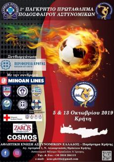 Κατά τις ημέρες 05 και 13 Οκτωβρίου 2019, στις πόλεις του Ηρακλείου, Χανιών και Αγίου Νικολάου Κρήτης, θα διεξαχθούν οι αγώνες του 1ου Παγκρήτιου Πρωταθλήματος Ποδοσφαίρου Αστυνομικών Ανδρών, οι οποίοι συνδιοργανώνονται από την Αθλητική Ένωση Αστυνομικών Ελλάδος, το Παράρτημα Κρήτης της Αθλητικής Ένωσης Αστυνομικών Ελλάδος και την Περιφέρεια Κρήτης.