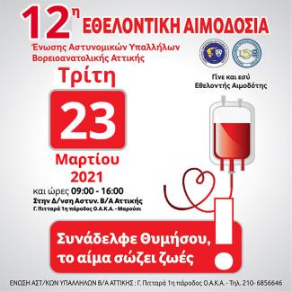 Την Τρίτη 23 Μαρτίου 2020 και από ώρες 09:00 έως 16:00 στην έδρα της Δ/νσης Αστυνομίας Β/Α Αττικής (Γ. Πιτταρά 1η πάροδος Ο.Α.Κ.Α., Μαρούσι) θα πραγματοποιηθεί εθελοντική ομαδική αιμοδοσία με σκοπό την ενίσχυση της τράπεζας αίματος της Ένωσής μας.