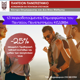 Το Κ.Ε.ΔΙ.ΒΙ.Μ. του Παντείου Πανεπιστημίου στο πλαίσιο των δραστηριοτήτων του στον τομέα της Δια Βίου μάθησης οργανώνει και υλοποιεί σε κύκλους ετήσια εξ αποστάσεως επιμορφωτικά μοριοδοτούμενα προγράμματα με απώτερο σκοπό την ανεύρεση νέας εργασίας ή τη στήριξη/ανέλιξη της ήδη υφιστάμενης τόσο στον ιδιωτικό όσο και στον δημόσιο τομέα.