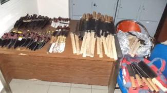 Τα παρά ένα… 100 τσεκούρια βρίσκονταν μέσα σε μία βαλίτσα που κατασχέθηκε και οι αστυνομικοί εκτιμούν ότι οι τρεις αλλοδαποί, δύο 45χρονοι και ένας 24χρονος, τα είχαν εισάγει λαθραία από την πατρίδα τους και σκόπευαν να τα πουλήσουν στην αγορά. Οι ίδιοι, πάντως, δεν το παραδέχθηκαν κι έτσι συνελήφθησαν και οδηγήθηκαν στον εισαγγελέα Πλημμελειοδικών Βόλου κατηγορούμενοι μόνο για παράνομη οπλοκατοχή.