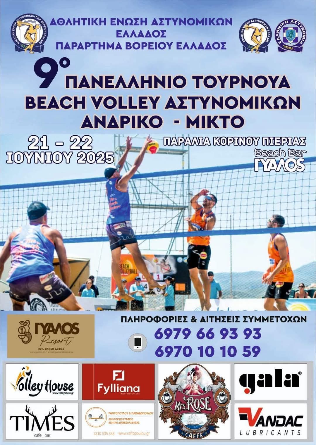 Σας γνωρίζουμε ότι η Διοικούσα Επιτροπή του Παραρτήματος Βορείου Ελλάδος της Αθλητικής Ένωσης Αστυνομικών προτίθεται να διοργανώσει το 9ο Πανελλήνιο Τουρνουά Πετοσφαίρισης στην Άμμο ( Beach Volley) Αστυνομικών στην Παραλία Κορινού στο Νομό Πιερίας το χρονικό διάστημα 21-22/06/2025.