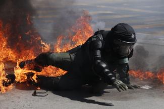 Κατά τη διάρκεια σύλληψης ενός εκ των ατόμων αυτών, από ρίψη μολότοφ πήρε φωτιά το δεξί του πόδι. Οι άνδρες των ΜΑΤ τον βοήθησαν χρησιμοποιώντας αντιπυρική κουβέρτα και πυροσβεστήρα για να σβήσουν τη φωτιά.