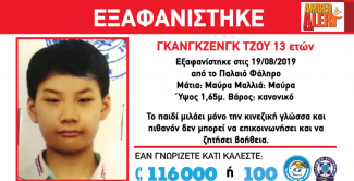 Την εξαφάνιση 13χρονου παιδιού, έξω από το σπίτι του στο Παλαιό Φάληρο στις 19/8/2019 (19:30) ανακοίνωσε το Χαμόγελο του Παιδιού.