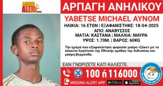 Στις 18/04/2025, βραδινές ώρες εξαφανίστηκε από την περιοχή της Αναβύσσου ο Yabetse Michael Aynom 16 ετών, με καταγωγή από την Αιθιοπία. Ο ανήλικος βρισκόταν στην Ελλάδα στο πλαίσιο συμμετοχής του σε ομάδα ποδοσφαίρου, ενώ στην εξαφάνιση του ενδεχομένως να εμπλέκονται συγγενικά του πρόσωπα. Το «Χαμόγελο του Παιδιού» ενημερώθηκε χτες, 19/4/2025 και άμεσα προχώρησε στη δημοσιοποίηση των στοιχείων του ανήλικου, κατόπιν εισαγγελικής εντολής, καθώς ενδέχεται να συντρέχουν λόγοι που θέτουν τη ζωή του σε κίνδυνο .