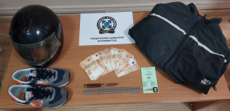 Βρέθηκαν και κατασχέθηκαν το χρηματικό ποσό των 1.100 ευρώ από τα αφαιρεθέντα χρήματα, ο σουγιάς, το κράνος, ρουχισμός και η μοτοσικλέτα που χρησιμοποίησε o κατηγορούμενος κατά την τέλεση της ληστείας.