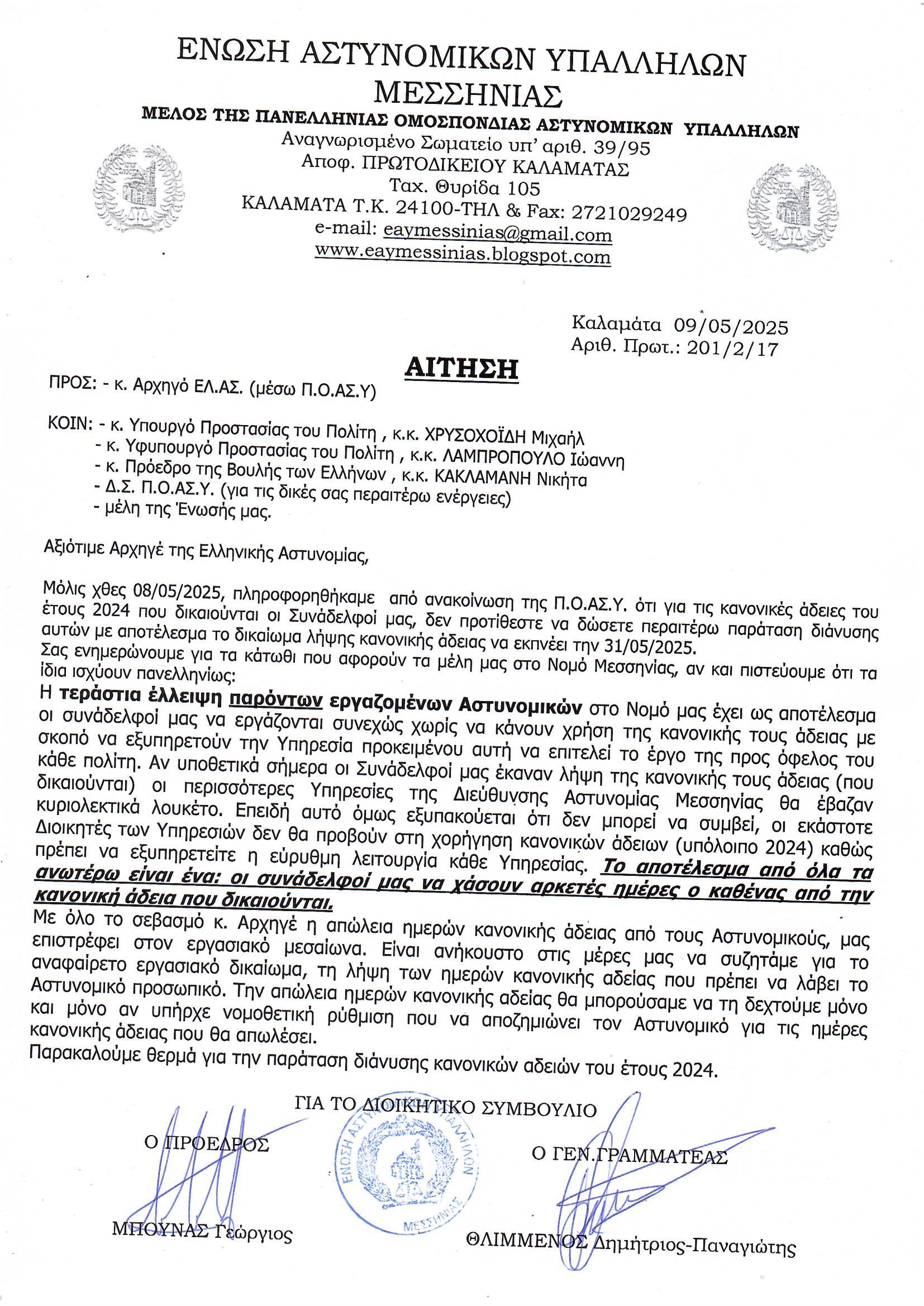 Κυρίες και κύριοι συνάδελφοι, Σας προωθούμε την κάτωθι αίτηση της Ένωσής μας προς τον κ. Αρχηγό της ΕΛ.ΑΣ. σχετικά με την παράταση διάνυσης κανονικών αδειών του έτους 2024.