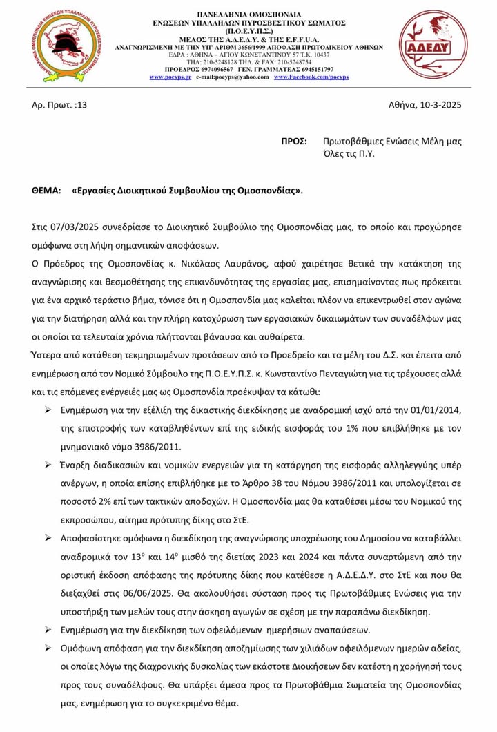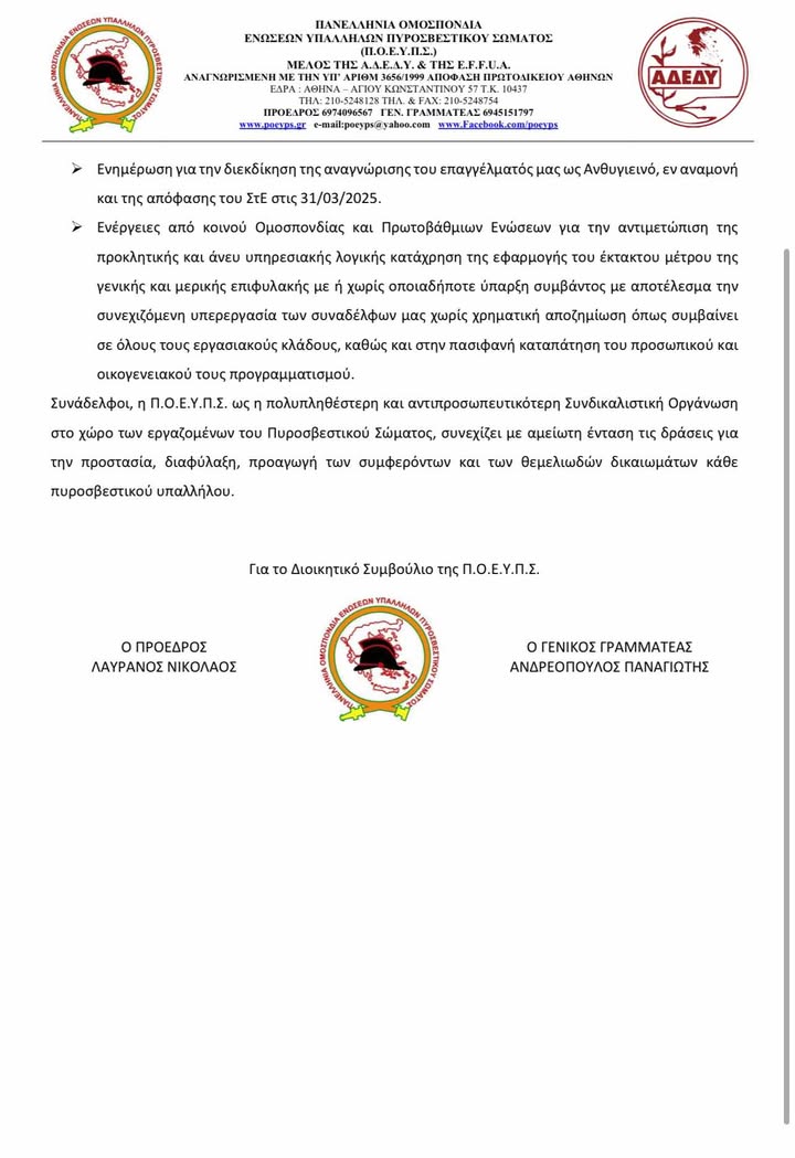Ανακοίνωση της Πανελλήνιας Ομοσπονδίας Ενώσεων Υπαλλήλων Πυροσβεστικού Σώματος