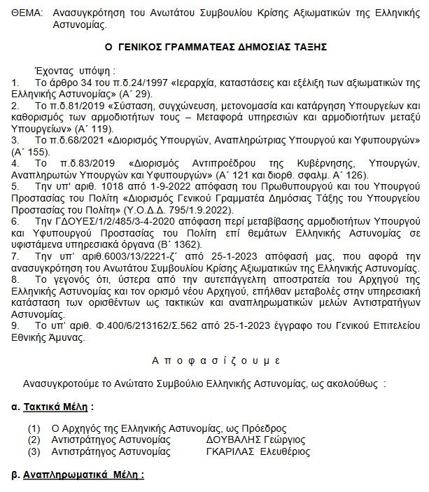 Ανασυγκροτήθηκε το Aνώτατο Συμβούλιο Κρίσης Αξιωματικών της Ελληνικής Αστυνομίας.