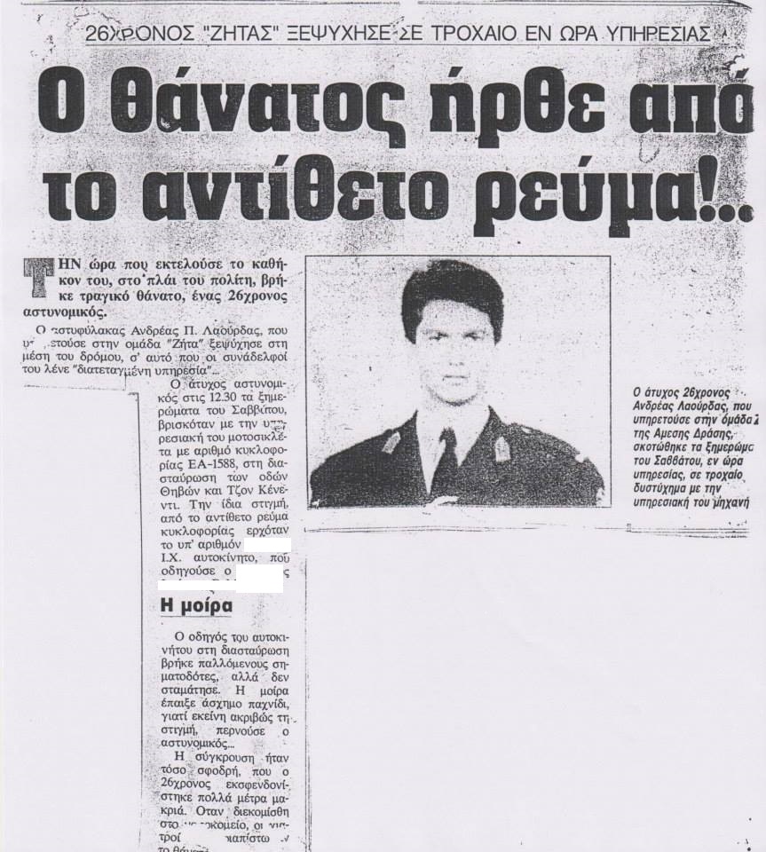 Στα μηνύματα των αναγνωστών μας υπήρξε και ένα εξώφυλλο εφημερίδας της εποχής που αναφέρθηκε στον θάνατο του Αστυφύλακα Λαούρδα Ανδρέα.