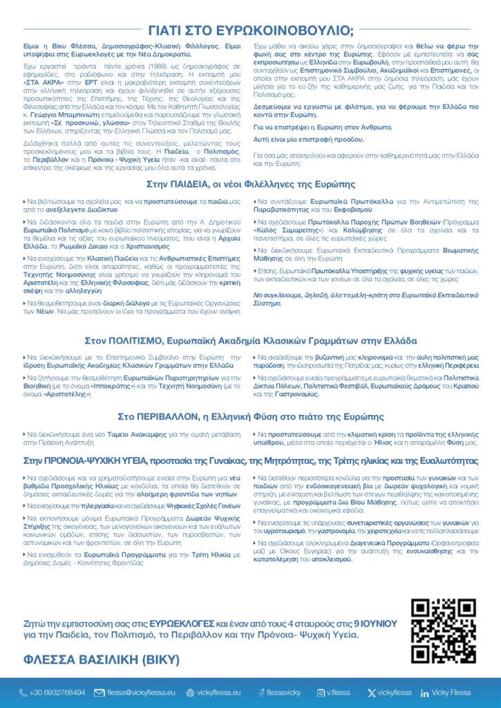 H Φλέσσα Βασιλική (Βὶκυ) προέρχεται από οικογένεια ενστόλων, είναι απόφοιτος της Φιλοσοφικής Σχολής του Εθνικού και Καποδιστριακού Πανεπιστημίου Αθηνών (Φιλολογικό Τμήμα, Κλασική Κατεύθυνση). Επίσης, είναι πτυχιοὺχος της Νομικής Σχολής Αθηνών.