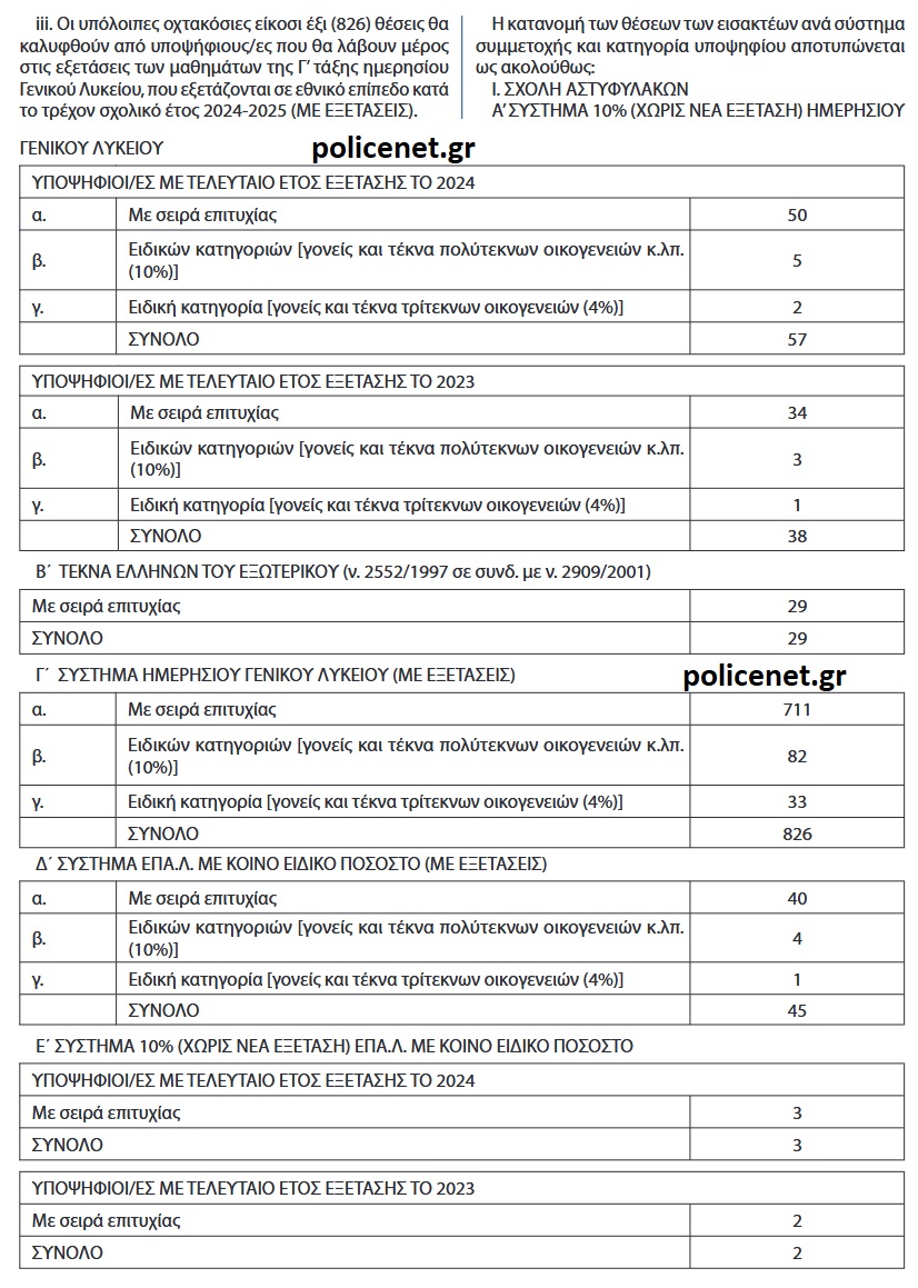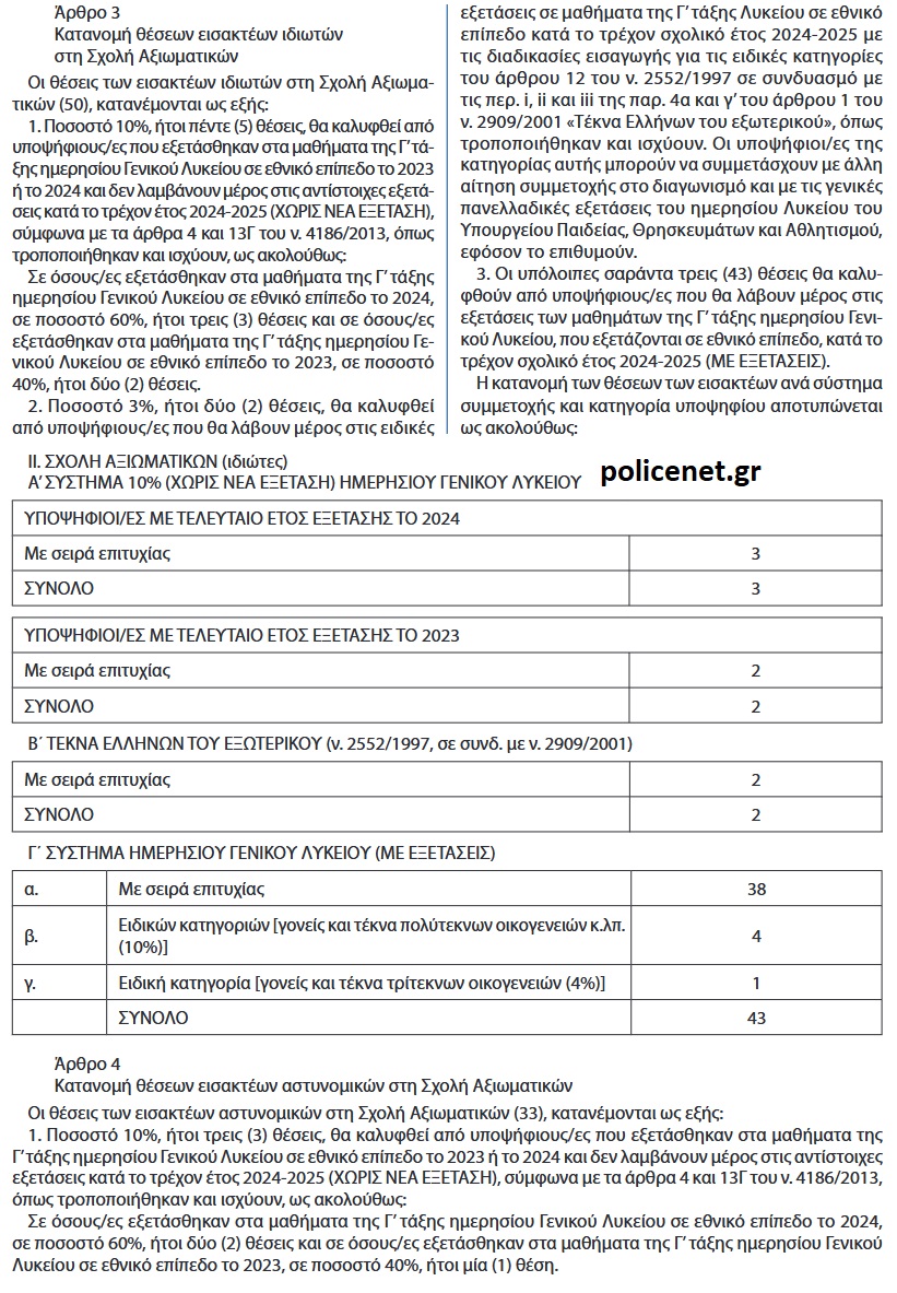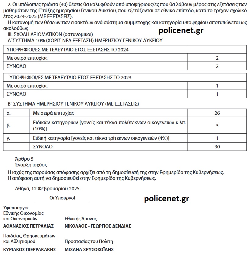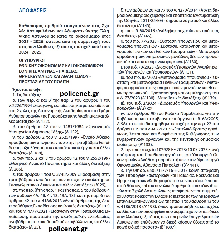 Δημοσιεύτηκε στην Εφημερίδα της Κυβερνήσεως η Υπουργική Απόφαση που αφορά τον Καθορισμό του αριθμού εισαγομένων στις Σχολές Αστυφυλάκων και Αξιωματικών της Ελληνικής Αστυνομίας κατά το ακαδημαϊκό έτος 2025 - 2026, ύστερα από τη συμμετοχή τους στις πανελλαδικές εξετάσεις του σχολικού έτους 2024 - 2025.