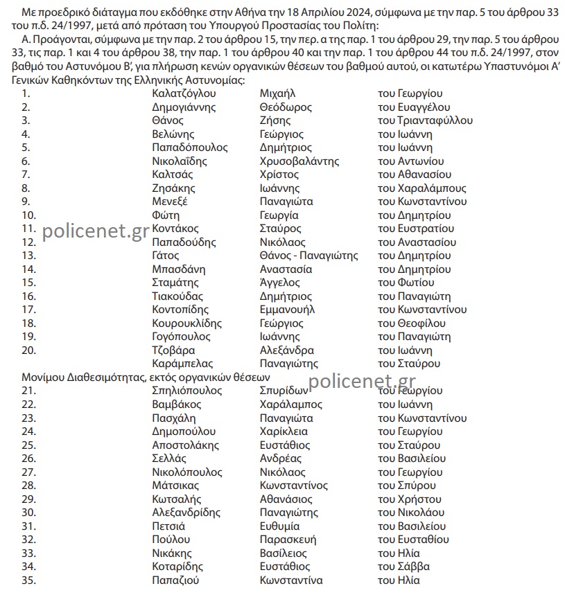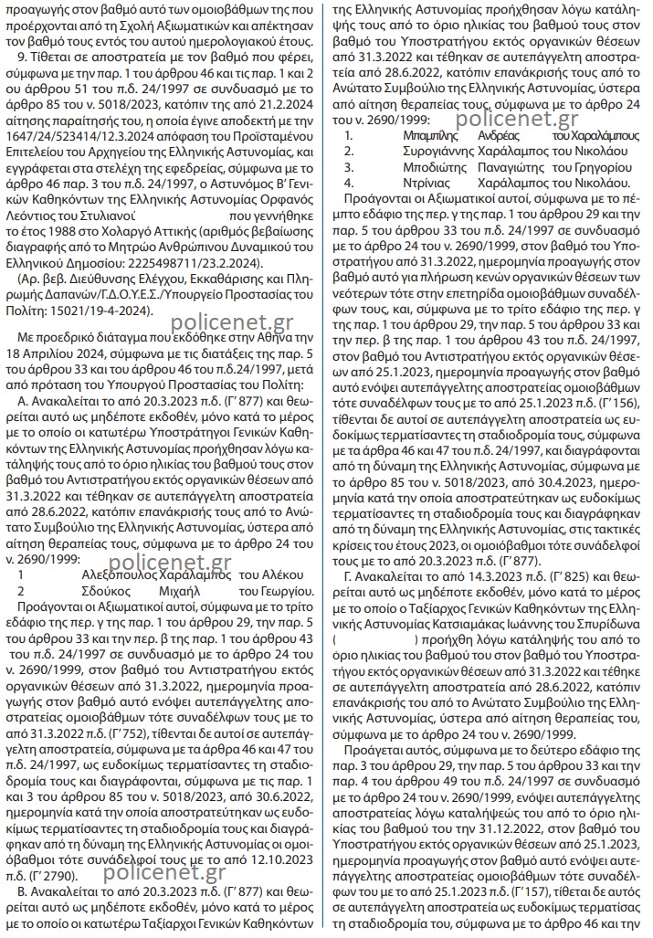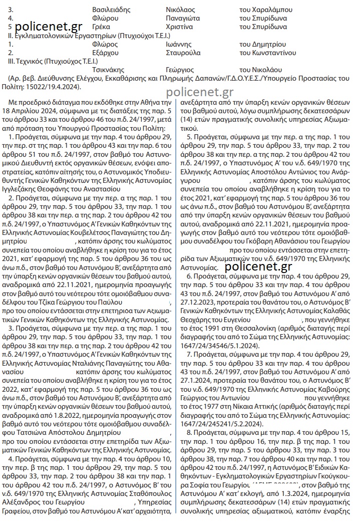 Δημοσιεύτηκε στην Εφημερίδα της Κυβερνήσεως η απόφαση του Υπουργού Προστασίας του Πολίτη κ. Μιχάλη Χρυσοχοϊδη, η οποία αφορά Προεδρικό Διάταγμα που εκδόθηκε στην Αθήνα την 18 Απριλίου 2024, σύμφωνα με την παρ. 5 του άρθρου 33 του π.δ. 24/1997 και περιλαμβάνει προαγωγές στελεχών της Ελληνικής Αστυνομίας.