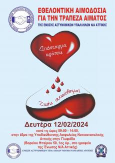 Σας περιμένουμε να δώσουμε όλοι μαζί λίγο από το χρόνο μας τη Δευτέρα 12/02/2024, κατά τις ώρες 09:00΄ έως 14:00΄, στην έδρα της Υποδιεύθυνσης Ασφαλείας Νοτιοανατολικής Αττικής στη Γλυφάδα (οδ. Βορείου Ηπείρου αρ. 50, 1ος όροφος, στο γραφείο της Ένωσης Ν/Α Αττικής).