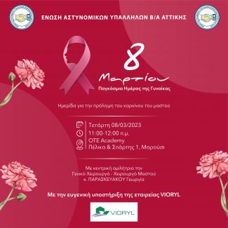 Η Ένωση Αστυνομικών Υπαλλήλων Βορειοανατολικής Αττικής με αφορμή τον εορτασμό της παγκόσμιας ημέρας της γυναικάς, διοργανώνει την Τετάρτη 8 Μαρτίου 2023 ημερίδα «για την πρόληψη του καρκίνου του μαστού».