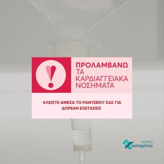 Το νέο κρατικό πρόγραμμα «Προλαμβάνω» (https://cardio.gov.gr) προσφέρει δωρεάν προληπτικό έλεγχο για καρδιαγγειακά νοσήματα σε άνδρες και γυναίκες 30-70 ετών. Στόχος του προγράμματος είναι, μέσα από την διενέργεια εξέτασης αίματος, να ανιχνευτούν εγκαίρως όλοι εκείνοι οι παράγοντες κινδύνου, όπως η υπέρταση, η χοληστερίνη και ο σακχαρώδης διαβήτης, προκειμένου να προληφθούν σοβαρές επιπλοκές, όπως το έμφραγμα και το εγκεφαλικό επεισόδιο.