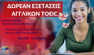 «Δηλώστε δωρεάν συμμετοχή σε πιστοποίηση της αγγλικής γλώσσας. Οι εξετάσεις είναι αναγνωρισμένες από τον ΑΣΕΠ και διεξάγονται από την Ελληνοαμερικανική Ένωση. Τα εξέταστρα καταβάλλονται μόνο σε περίπτωση επιτυχίας στις εξετάσεις και εφόσον επιθυμείτε την έκδοση του πιστοποιητικού!