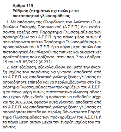 Όσοι λάβουν πιστοποιητικό γλωσσομάθειας με 2 skills έως και 30.06.2024 θα αναγνωρίζεται από τον ΑΣΕΠ κανονικά.