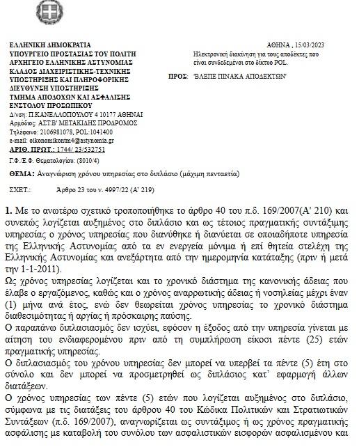 Σε συνέχεια του υπ’ αριθ. 500/10η από 6/3/2023 εγγράφου μας και τις εν γένει ενέργειες του συνδικαλιστικού κινήματος ώστε να είναι δυνατή η αναγνώριση της μάχιμης πενταετίας από όλο το προσωπικό, εκδόθηκε η υπ’ αριθ. 1744/23/532751 από 15/03/23 Διαταγή του Κλάδου Διαχειριστικής – Τεχνικής Υποστήριξης και Πληροφορικής Α.Ε.Α., η οποία, σύμφωνα με την άποψή μας, κινείται προς τη σωστή κατεύθυνση.