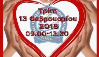 Η Ένωση μας διοργανώνει εθελοντική αιμοδοσία που θα πραγματοποιηθεί την Τρίτη, 13 Φεβρουαρίου 2018 κατά τις ώρες 09:00 έως 13:30 στο Α.Τ. Αγίου Νικολάου και καλούμε όλη την κοινωνία να συμμετέχει .