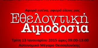 Την Τρίτη 13-01-2015 και ώρες 09:00 έως 13:00 στο Αστυνομικό Μέγαρο Θεσσαλονίκης θα πραγματοποιηθεί εθελοντική ομαδική αιμοδοσία με σκοπό την ενίσχυση της τράπεζας αίματος της Ένωσής μας.