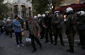 Ο πετροπόλεμος είχε μικρή διάρκεια, ενώ οι κουκουλοφόροι έβαλαν φωτιά σε έναν κάδο, έσπασαν μερικές βιτρίνες καταστημάτων και προκάλεσαν ζημιές σε ένα αυτοκίνητο.