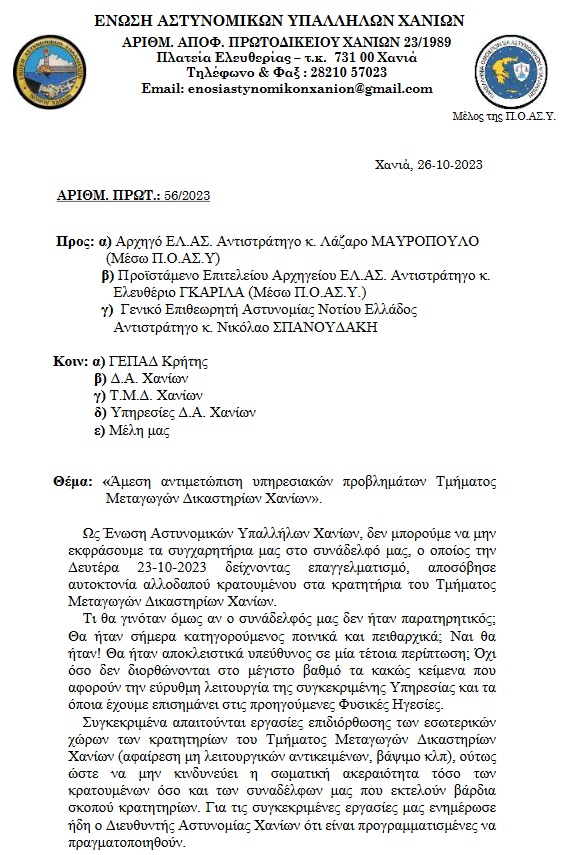 Θέμα: «Άμεση αντιμετώπιση υπηρεσιακών προβλημάτων Τμήματος Μεταγωγών Δικαστηρίων Χανίων»