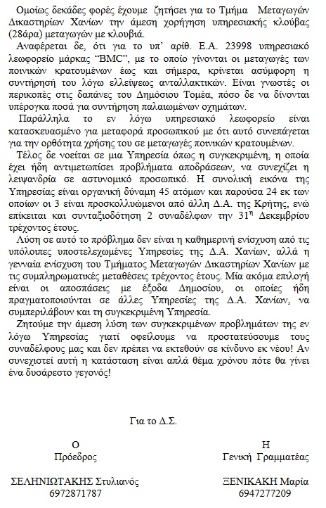 Επίσης, επιβάλλεται η άμεση εξασφάλιση κατάλληλου οχήματος μεταγωγών, αλλά και η κάλυψη των πολλών κενών οργανικών θέσεων προσωπικού, με προοπτική ουσιαστικής ενίσχυσης ολόκληρου του Τμήματος Μεταγωγών Δικαστηρίων Χανίων. Είτε με τις συμπληρωματικές μεταθέσεις τρέχοντος έτους είτε με τη διαδικασία των αποσπάσεων με έξοδα Δημοσίου που πραγματοποιούνται ήδη σε άλλες Υπηρεσίες της Δ.Α. Χανίων.