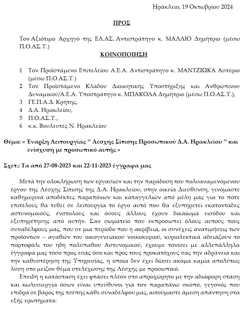 Δείτε το σχετικό έγγραφο της Ένωσης Αστυνομικών Ηρακλείου: