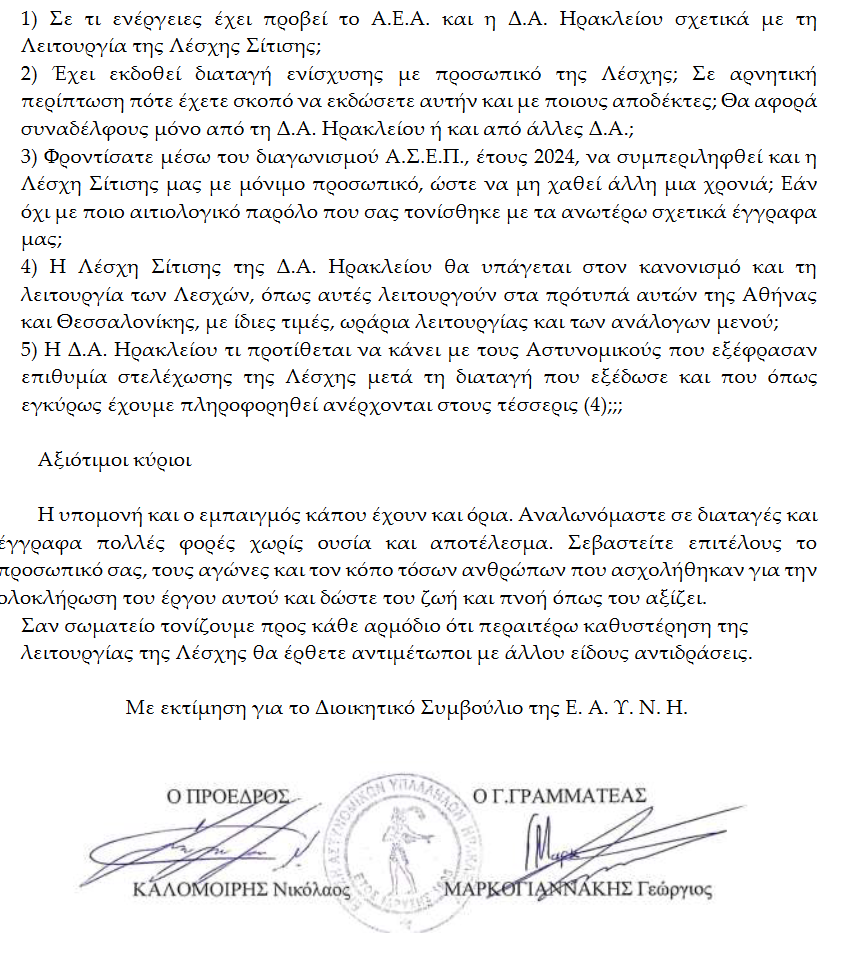 Η Ένωση Αστυνομικών Υπαλλήλων Ηρακλείου, με το επισυναπτόμενο έγγραφό της, εκφράζει την έντονη διαμαρτυρία της για την αδιαφορία που επιδεικνύεται αναφορικά με την λειτουργία της Λέσχης Σίτισης της Δ.Α. Ηρακλείου.