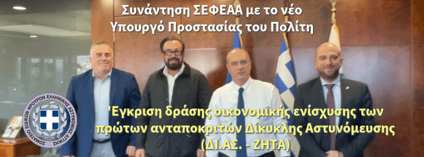 Την 8 Νοεμβρίου 2023 ο Πρόεδρος και ο Γενικός Γραμματέας του ΣΕΦΕΑΑ πραγματοποίησαν συνάντηση με τον νέο Υπουργό Προστασίας του Πολίτη κ. Οικονόμου Ιωάννη.