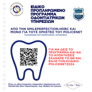 Το ειδικό προπληρωμένο πρόγραμμα οδοντιατρικών υπηρεσιών σχεδιάστηκε, οργανώθηκε και διατίθεται από τη SMILEPERFECTION HDBC για τις οδοντιατρικές ανάγκες, αστυνομικών, πυροσβεστών, λιμενικών και στρατιωτικών, εν ενεργεία και απόστρατων, με επίδειξη της υπηρεσιακής τους ταυτότητας.