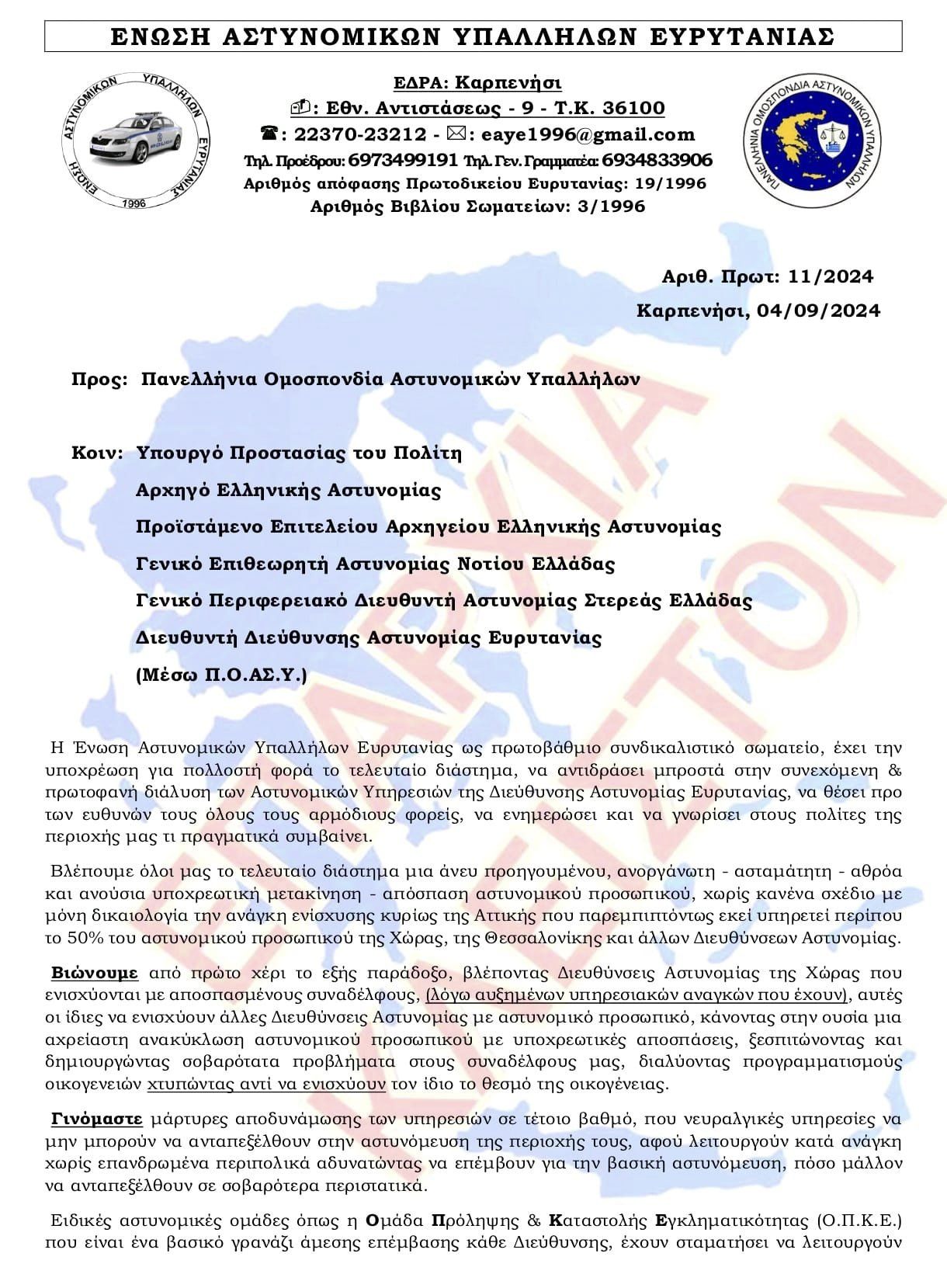 Εικόνα 08:44 | 10/09/2024 ΕΝΩΣΗ ΑΣΤΥΝΟΜΙΚΩΝ ΕΥΡΥΤΑΝΙΑΣ ΕΝΩΣΗ ΑΣΤΥΝΟΜΙΚΩΝ ΕΥΡΥΤΑΝΙΑΣ ΣΥΝΔΙΚΑΛΙΣΤΙΚΕΣ ΕΝΩΣΕΙΣ ΕΛ.ΑΣ.