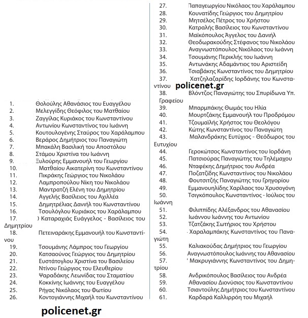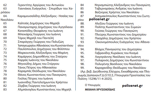 οι κατωτέρω Αστυνόμοι Α’ Γενικών Καθηκόντων της Ελληνικής Αστυνομίας στον βαθμό του Αστυνομικού Υποδιευθυντή κατ’ εκλογή, ανεξάρτητα από την ύπαρξη κενών οργανικών θέσεων, από 14.03.2025, ημερομηνία συμπλήρωσης έξι (6) ετών πραγματικής υπηρεσίας στον βαθμό τους: