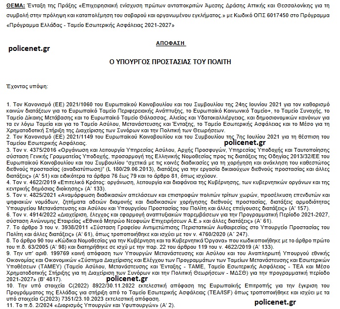 Ένταξη της Πράξης «Επιχειρησιακή ενίσχυση πρώτων ανταποκριτών Άμεσης Δράσης Αττικής και Θεσσαλονίκης για τη συμβολή στην πρόληψη και καταπολέμηση του σοβαρού και οργανωμένου εγκλήματος.» με Κωδικό ΟΠΣ 6017450 στο Πρόγραμμα «Πρόγραμμα Ελλάδας - Ταμείο Εσωτερικής Ασφάλειας 2021-2027»